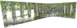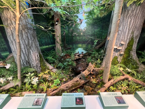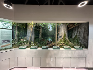 This diorama gives a glimpse into the thick, impassable ground of the Great Black Swamp before it was drained by early settlers. The trees were built using molds of real bark found in the wetland and the plants, taxidermy, and painted wildlife are all reminiscent of native species found in the swamp.