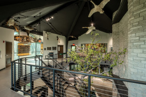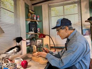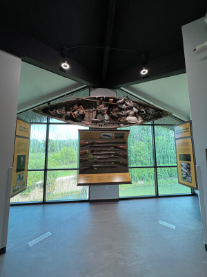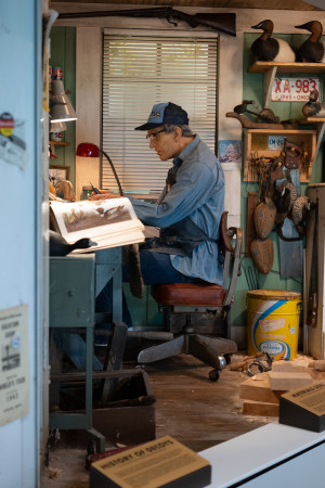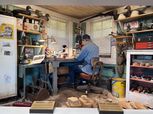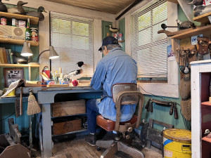 The second floor of the center focuses on hunting and decoy carving heritage. The decoy carving diorama features an example of a decoy carver’s studio space where he would have perfected his craft. The diorama includes a sculpted mannequin and found objects to bring the room to life.