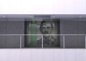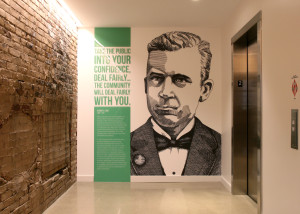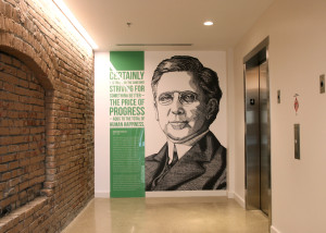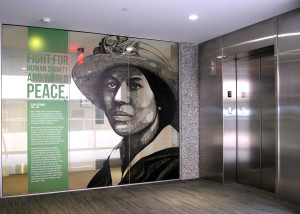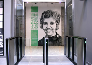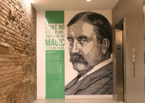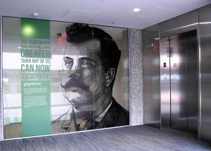 The printed murals are installed inside of the new Promedica headquarters building in Toledo, OH. It highlights influential people from the area and explains their importance in the development of the city.