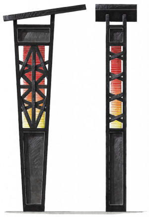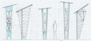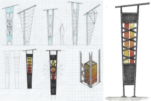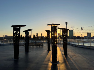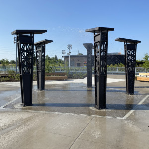 Created for the Glass City Metropark, this plaza of lighted rain towers mist water to cool off beneath on hot summer days.