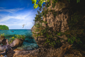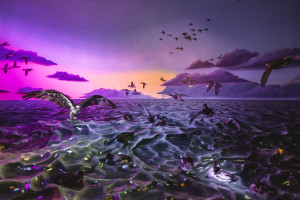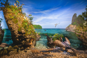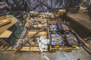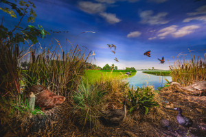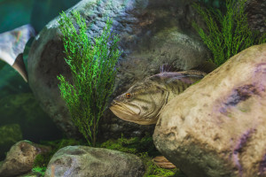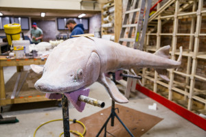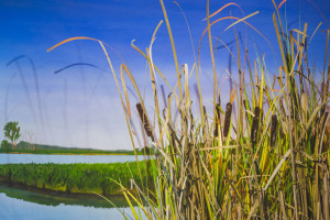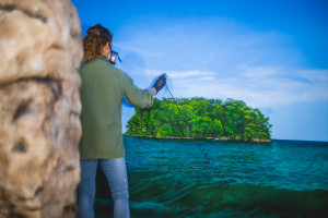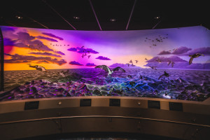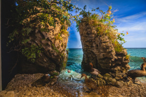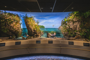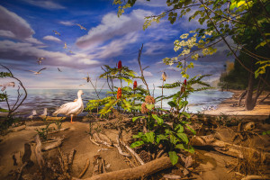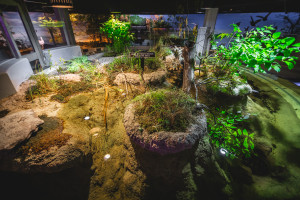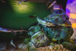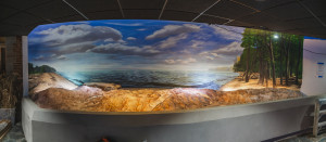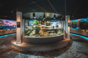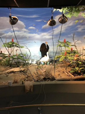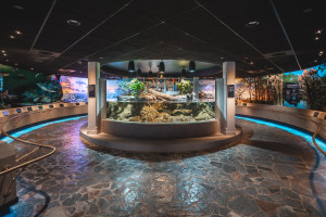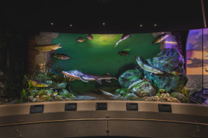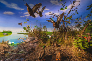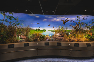 The Wetlands and Lakes room features a perimeter of dioramas that highlight open water, beneath the water, forested beach ridge and wetlands of Lake Erie. Each diorama includes carefully placed taxidermy, sculpted animals and environments, murals, and interactive sound effects. The center of the room features a large wetland scene aquatic tank that includes a sculpted base and live animals.